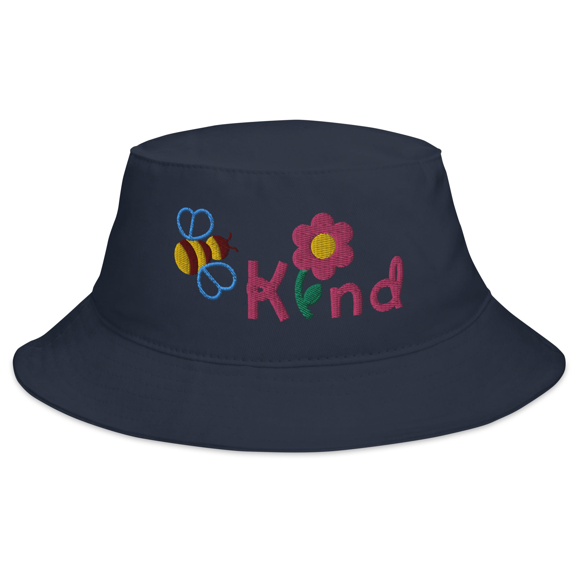 Our lovely "Be Kind" embroidery design adds beauty and dimension to the practicality and comfort of this one-of-a-kind bucket hat.