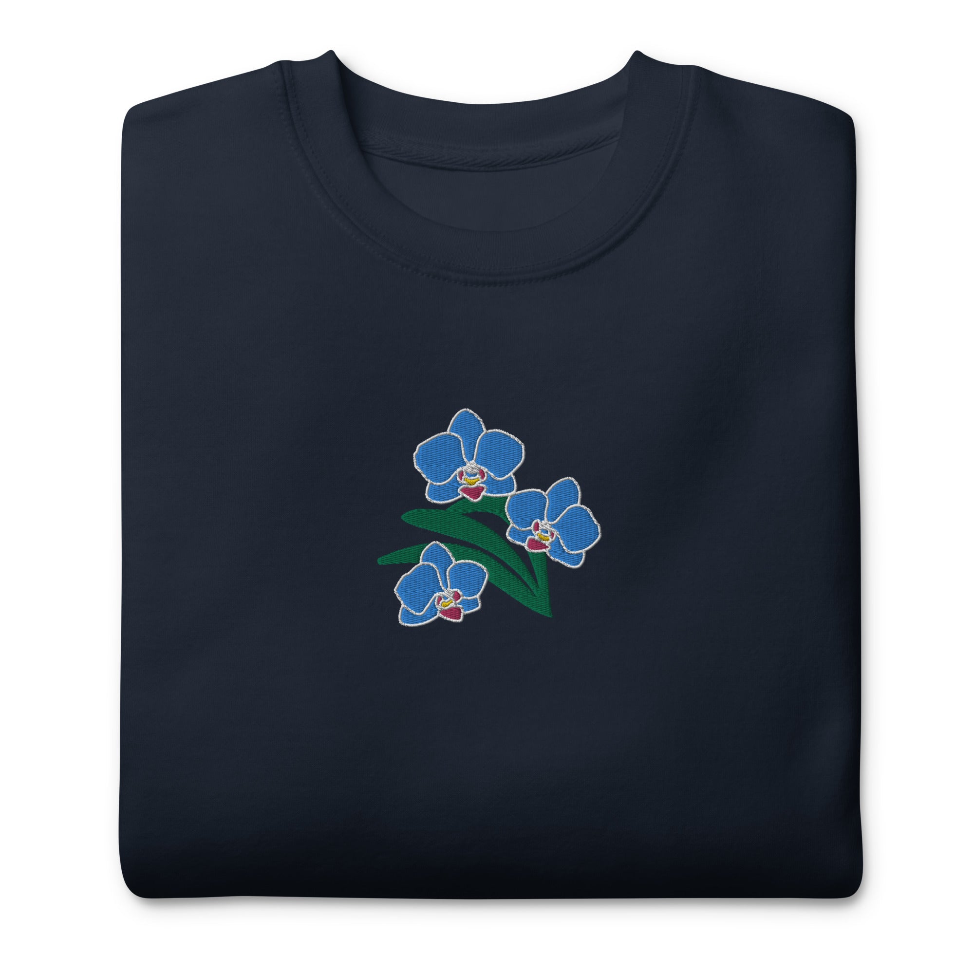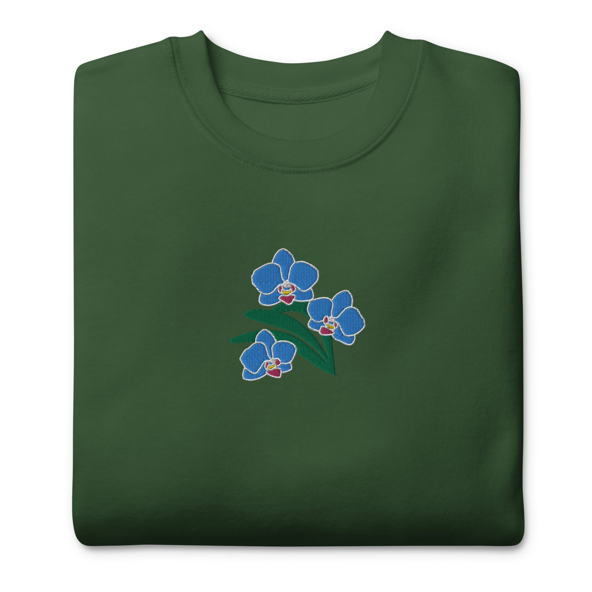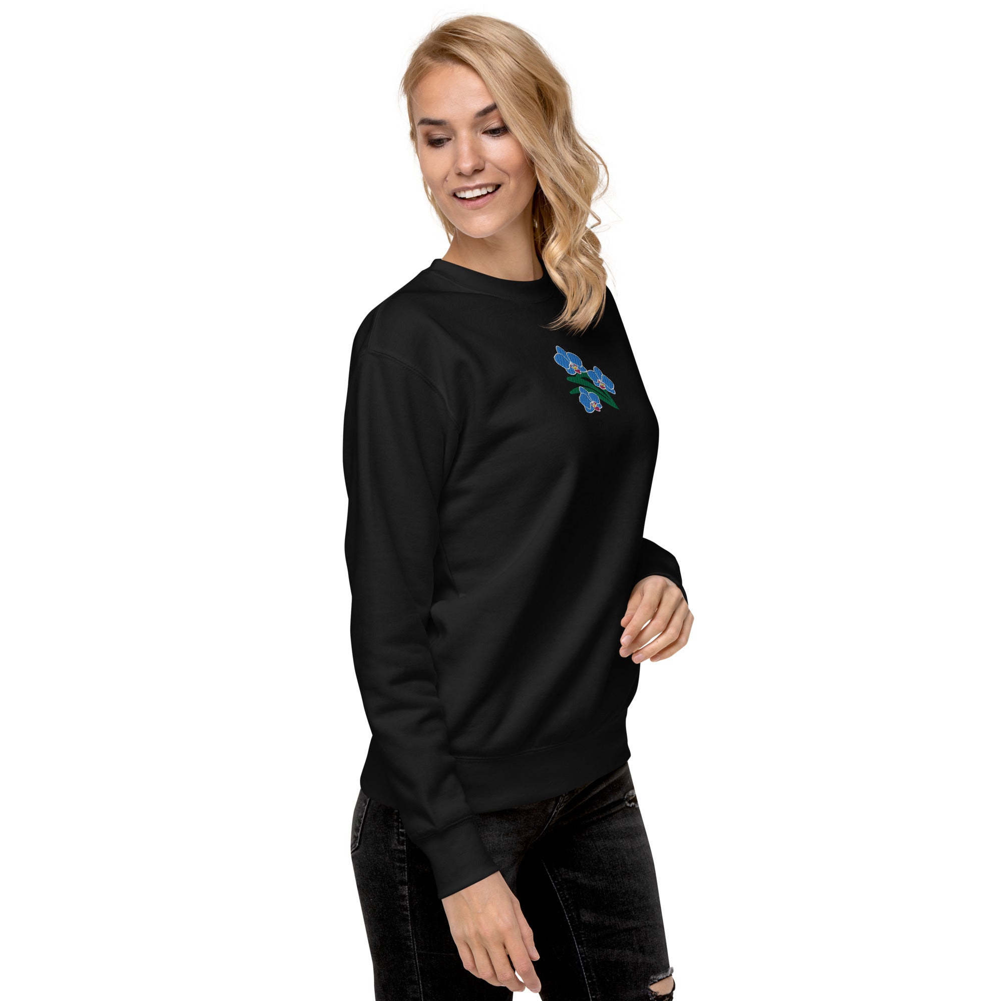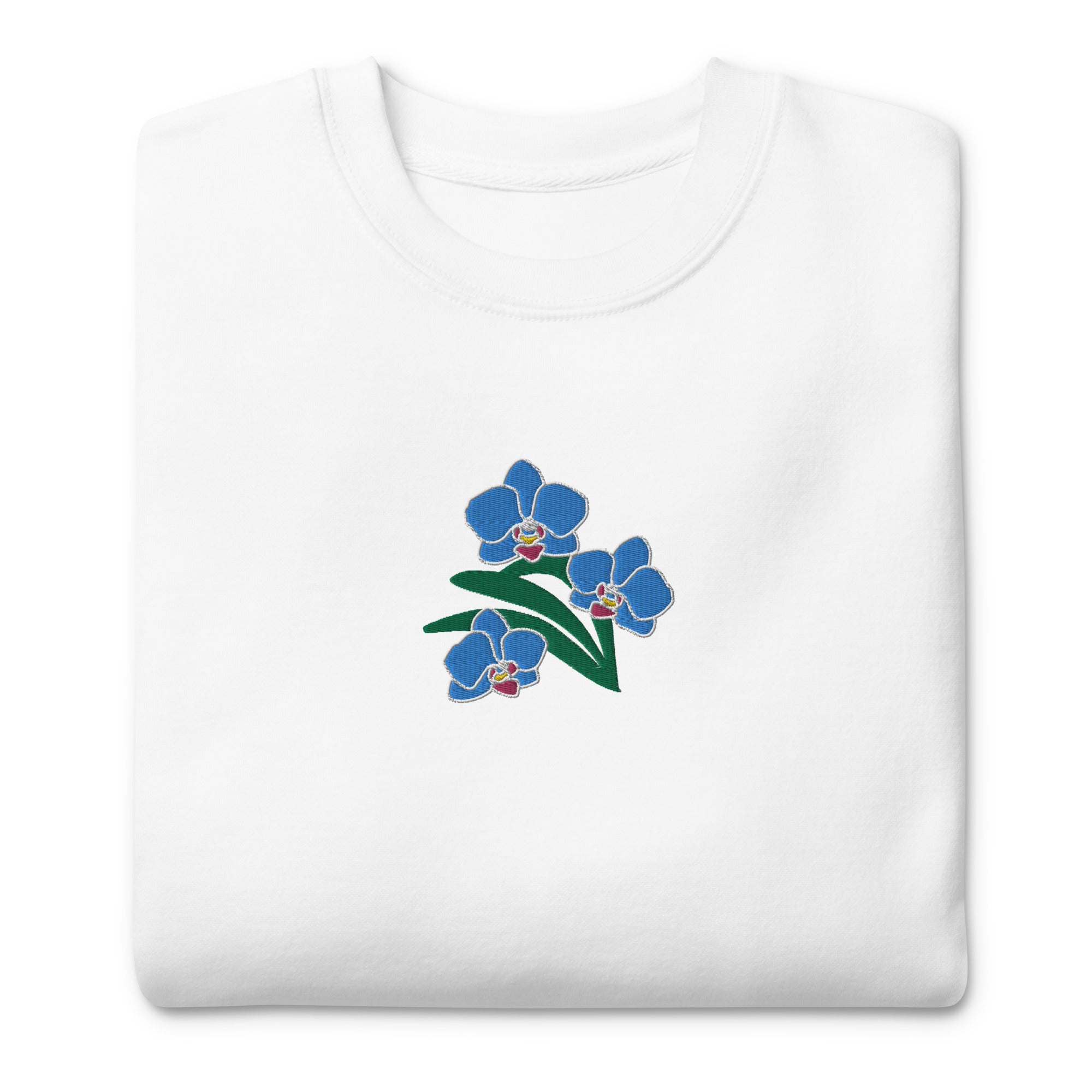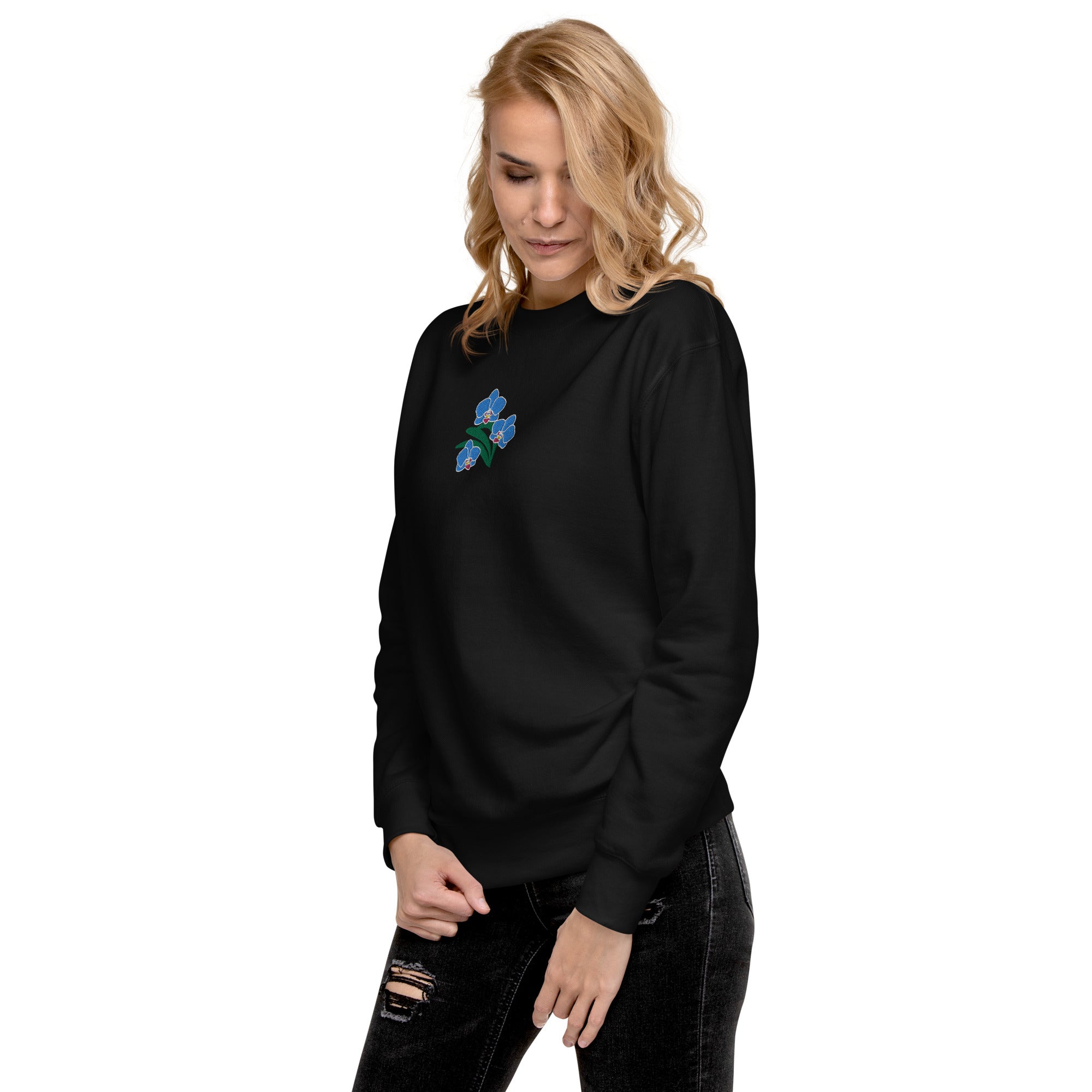 Looking for a cozy and comfy sweatshirt that suits your style? Look no further than our unisex premium sweatshirt. It is a perfect choice for anyone who values comfort and style. Plus, our “Blue Orchids” embroidery design adds a touch of elegance and personality to this versatile garment.