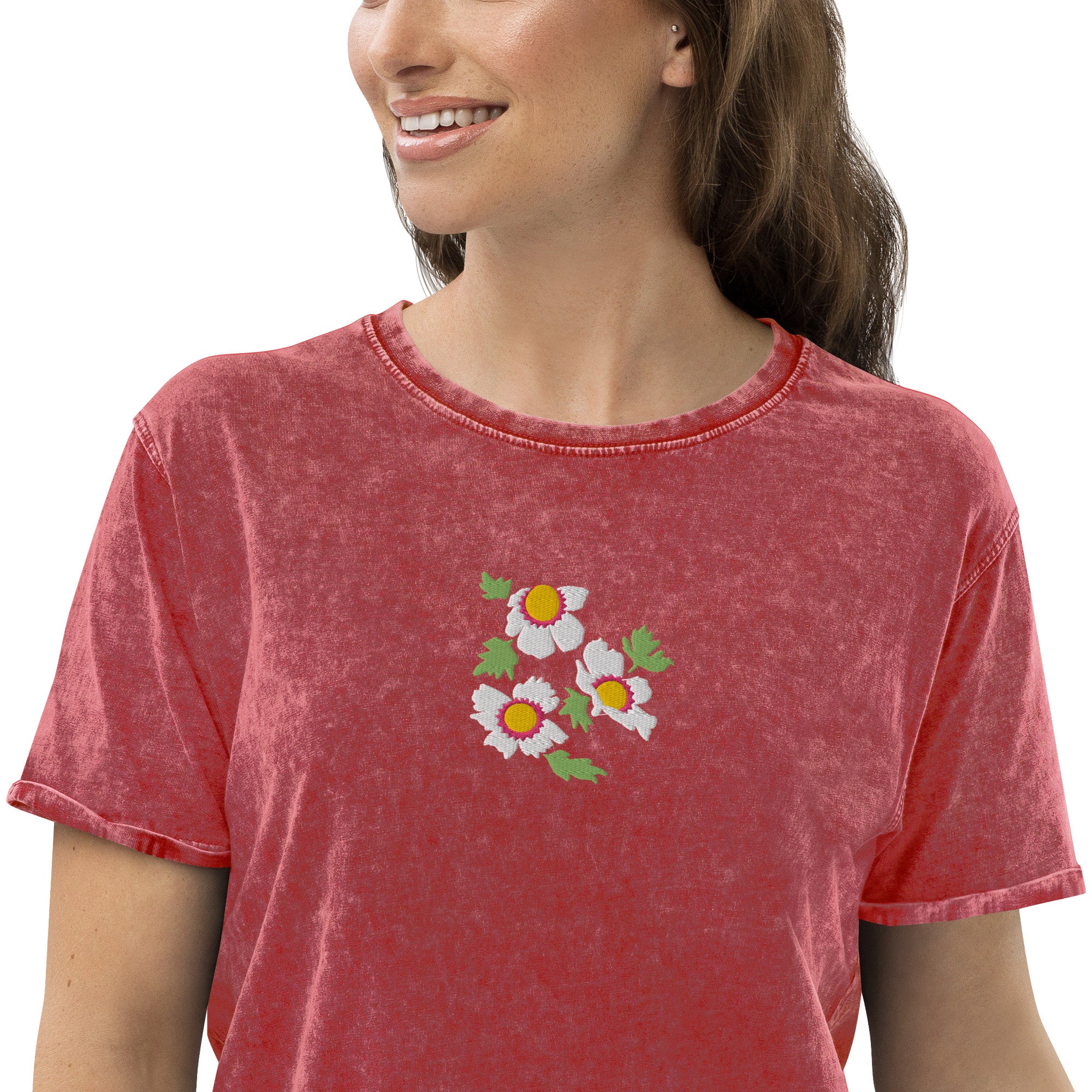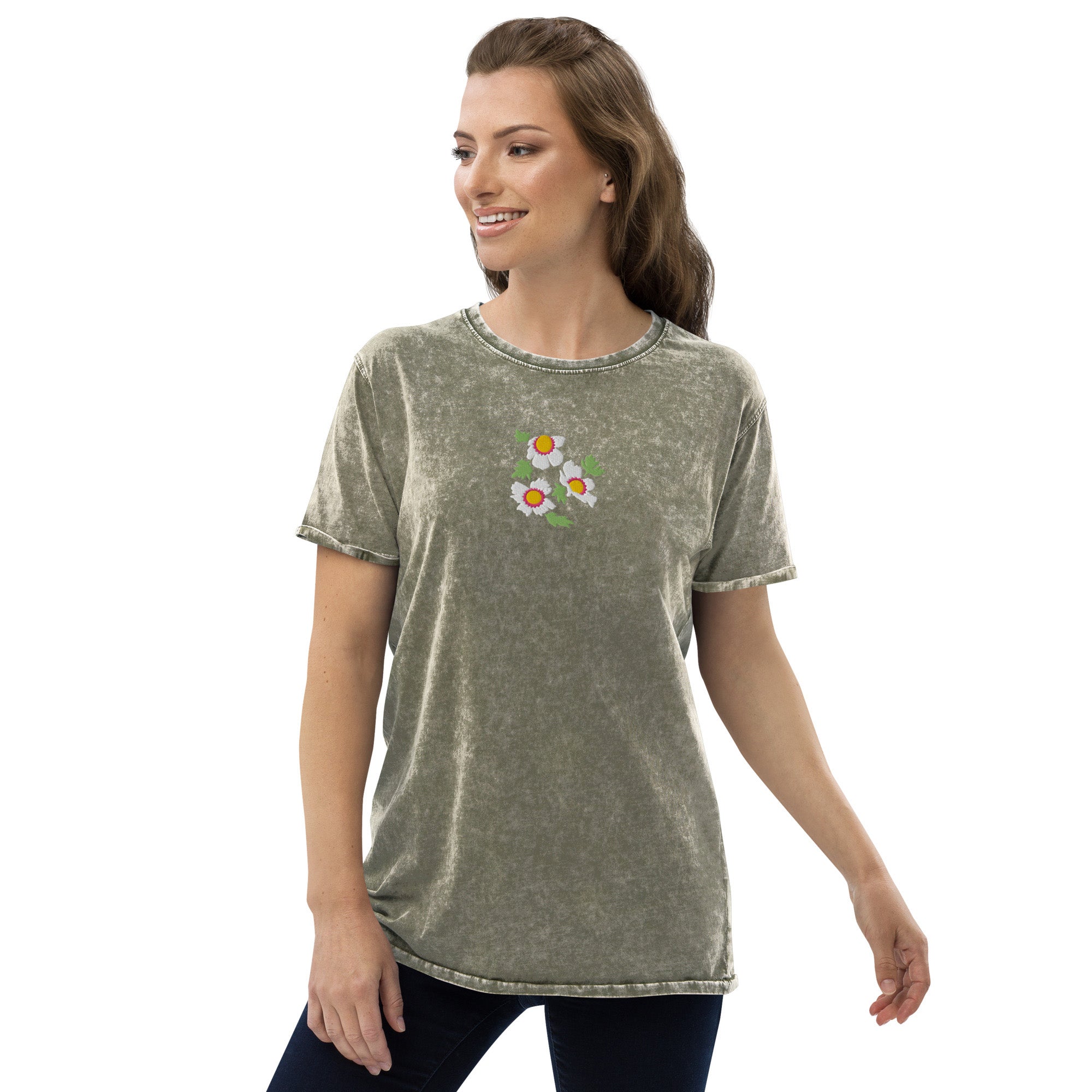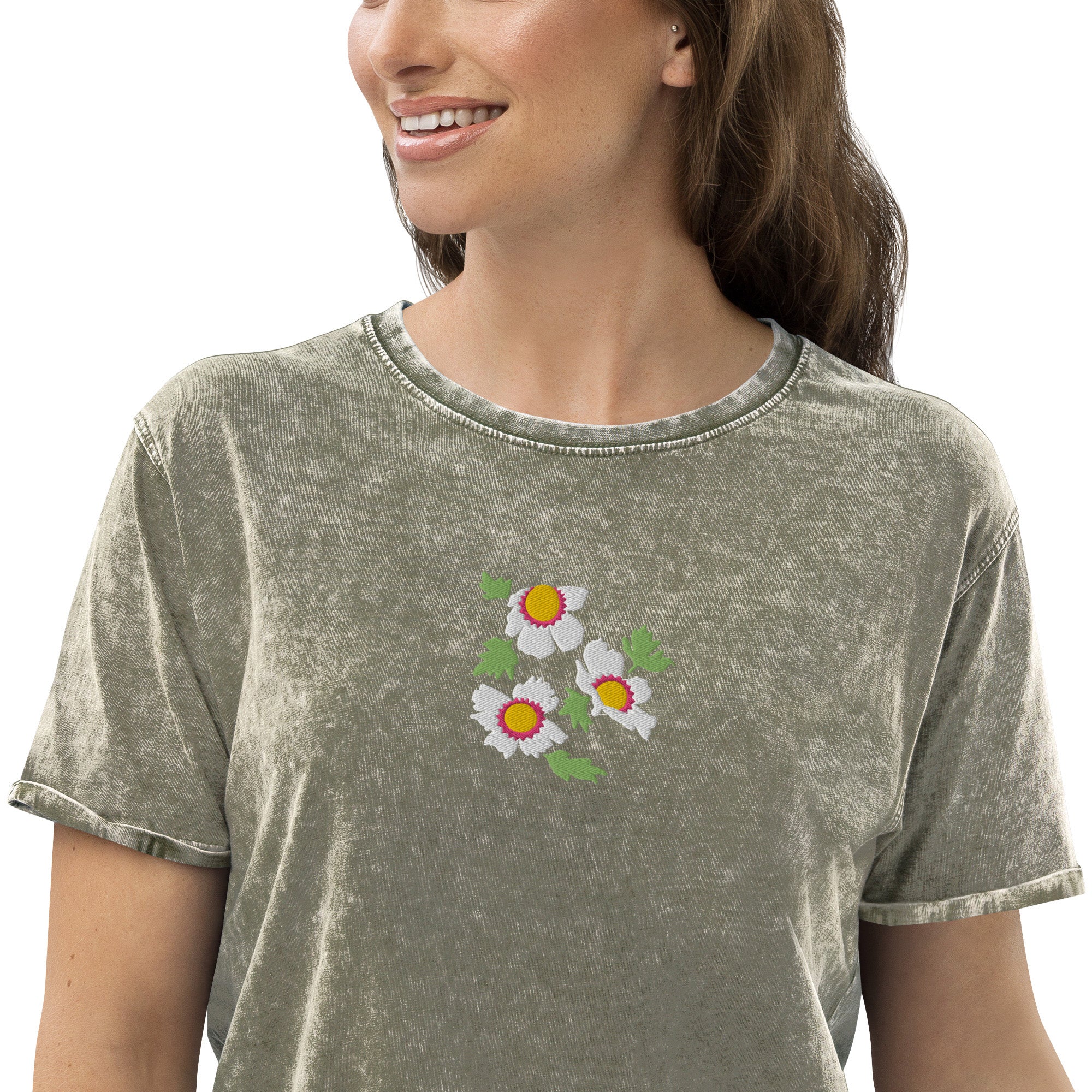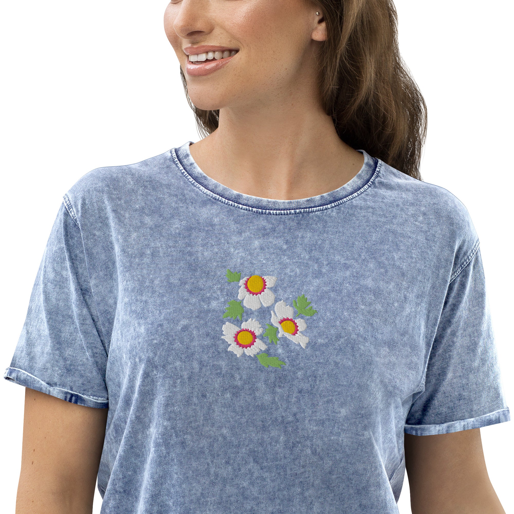 Our eye-catching "Whimsical Flowers" embroidery design adds dimension to this charming tee.